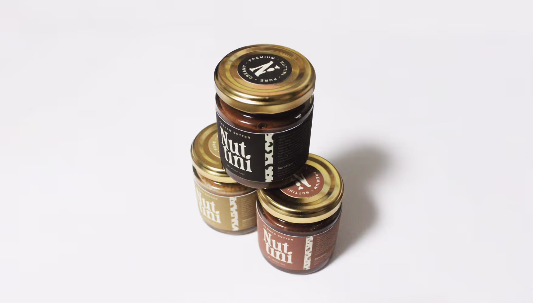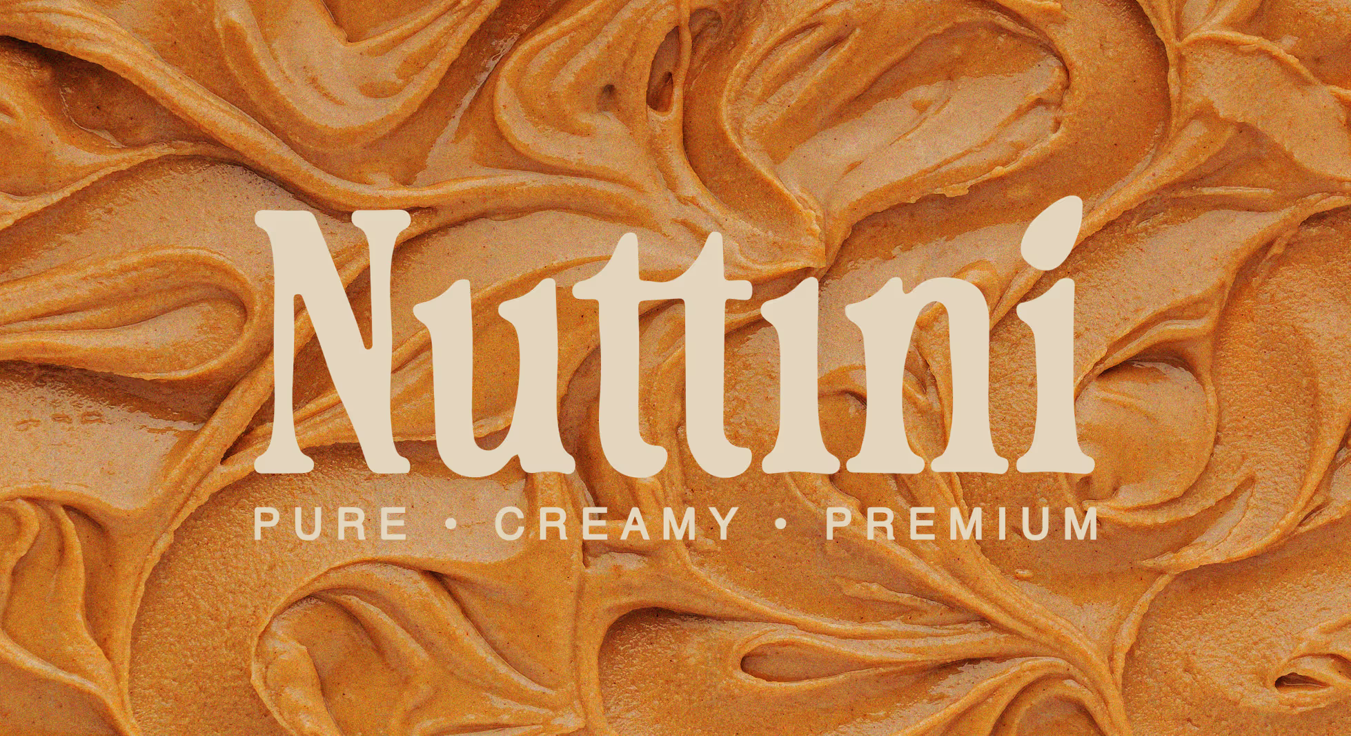 Nuttini is a nut butter brand, featuring flavors like peanut and almond. My design approach was inspired by the provided keywords: pure, creamy, and premium.